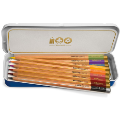 L’astuccio in metallo è ulteriormente impreziosito all’interno da un foglio di carta Canson personalizzato 100 anni, che avvolge e custodisce i pastelli.